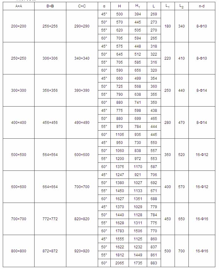 500×500 | 564×564 | 600×600 | 45° | 470 | 310 | 350 | 480 | 16-Ф12 | DTⅡA250-M | 0.55 |