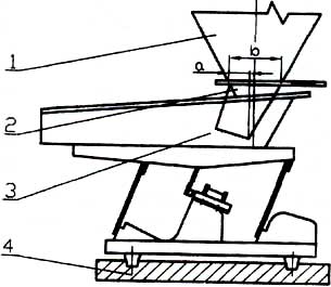 電磁振動給料機(jī)的振幅和給料量受料倉倉壓影響較大,設(shè)計料倉時應(yīng)盡量減少倉壓,使溜咀后側(cè)板承受一定的倉壓,并設(shè)置斜溜沮及下料閘門。如圖,一般a=1/4b。溜咀四周應(yīng)與給料槽留有一定的間隙,一般5~10mm,以免產(chǎn)生噪音及影響振動。